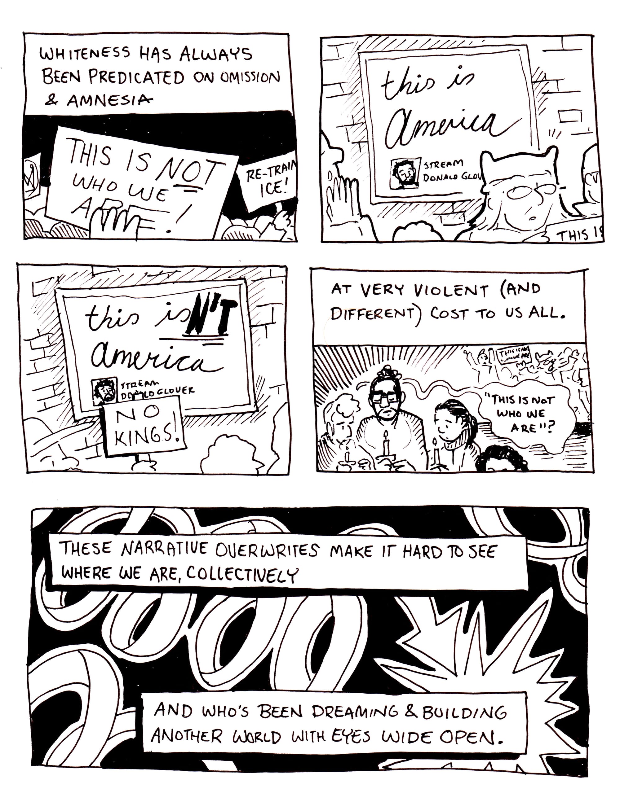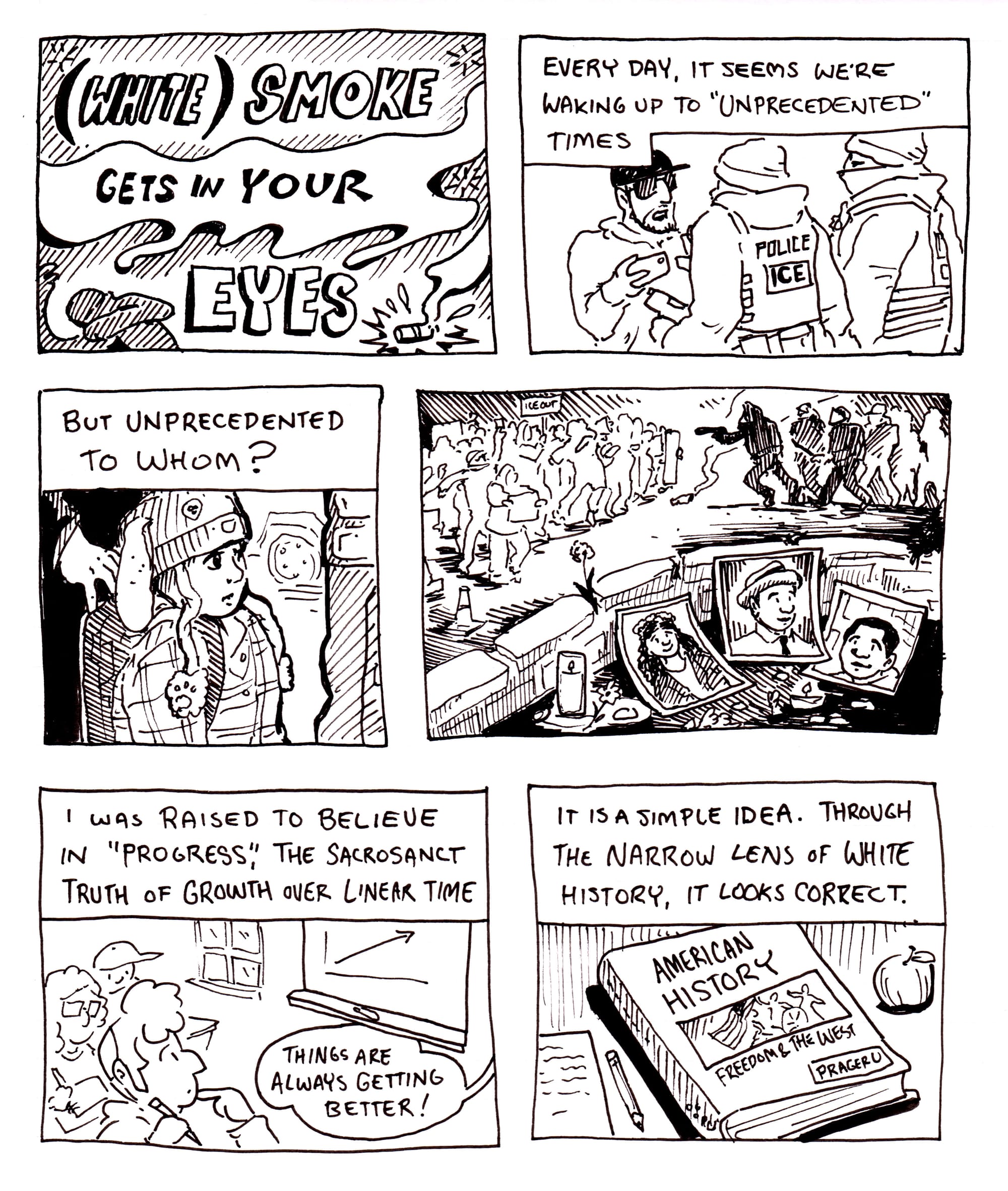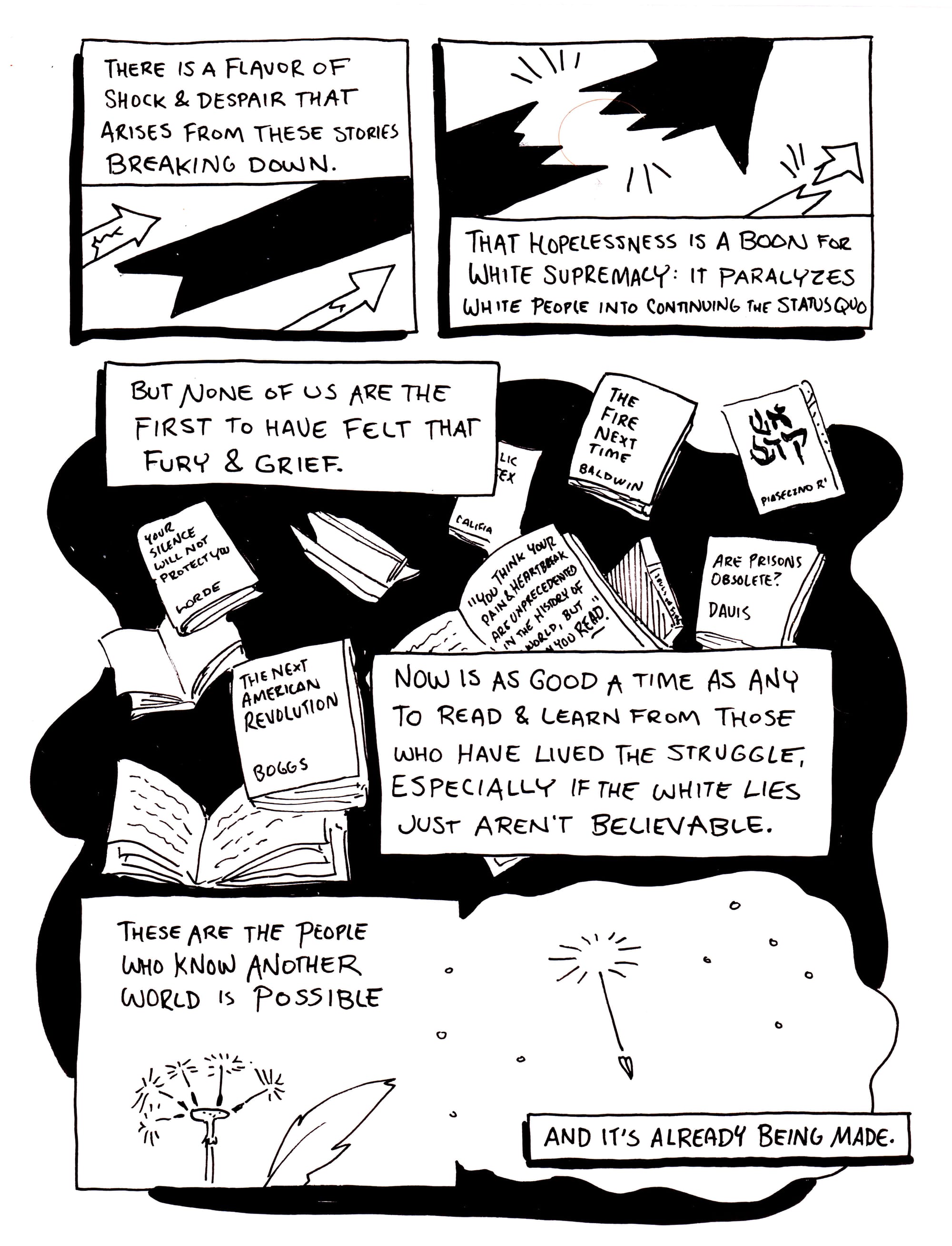 As lovingly as possible, I wanted to write this comix-essay not only for those who are witnessing white confusion, but for those who may be experiencing that confusion themselves. There is comfort to be found in knowing there are many others before us who have faced the enormity of this dying world's grief. They have seen it in previous decades, from angles that I have not. What they saw did not vanish into history; it has rolled into today. They have seen the same thing you are beginning to see now, in a different place, in a different time, and usually, in a different racialized, abled, or gendered body.