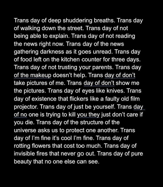 On opposite sides of the year lie our two Trans holidays: one for display, one for grief. Trans Day of Visibility in the early spring (March 31st) followed by Trans Day of Remembrance in the late autumn (November 20th). Both are during the cold edges of the season. Both were created to acknowledge and raise up central political struggles inside of trans life. And every year, both result in the same set of commentary, namely, that there is so much more to trans life than mourning and the visibility that so often leads to more mourning.