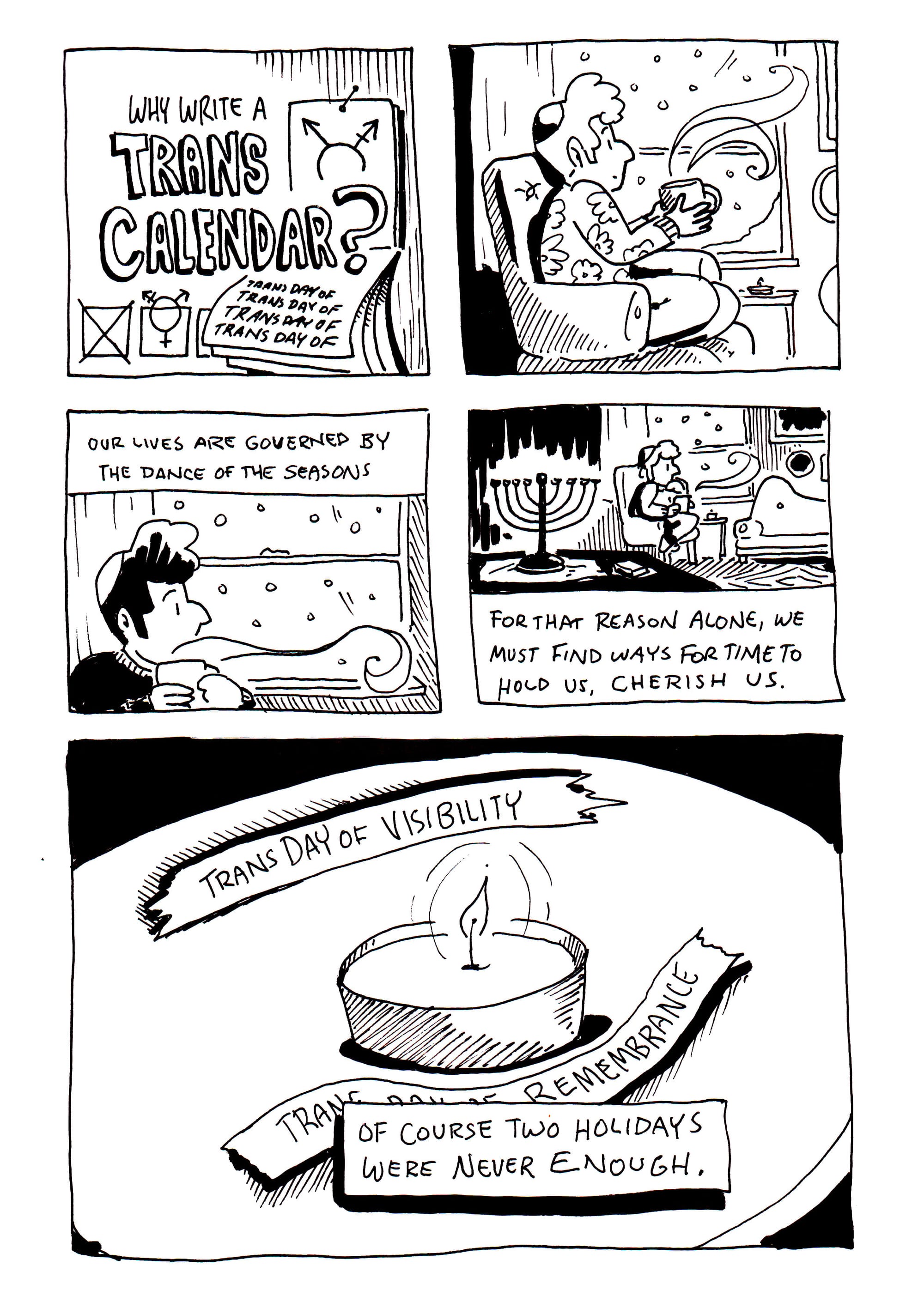 I'm certain that Ezra's words echoed in me when I decided to create a full 365 days' worth of holidays (plus bonus leap-year addition, February 29th, Trans Day of Leaping). I had to make some decisions about its format—initially a standard wall calendar seemed like the way to go, but that would mean it would have to be redone each year as the days and dates changed. Then I had to decide if I would be following the Gregorian Calendar, or my equally native Hebrew one. Would it be lunar or solar? What celestial bodies govern how trans people mark time?