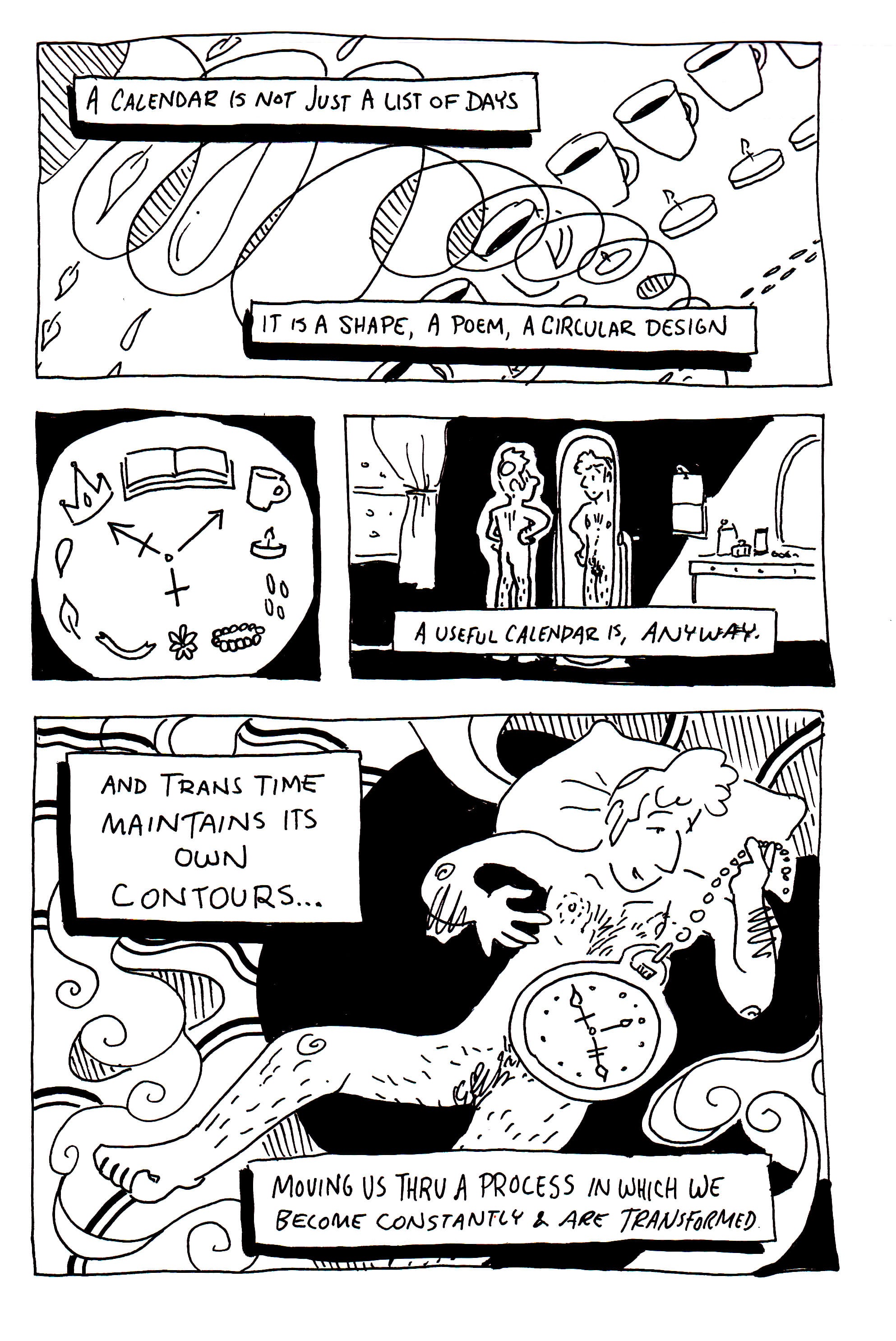 Being alive is a process of becoming. Time is the medium through which that becoming takes place. A Trans Calendar must then be a tool that guides us in our multiple processes of becoming: bodily transformation, experiences of exile and redemption, paradigm explosions, the finding and creation of family, expression of spirit, celebrations of love for ourselves, each other, and the source that animates us.