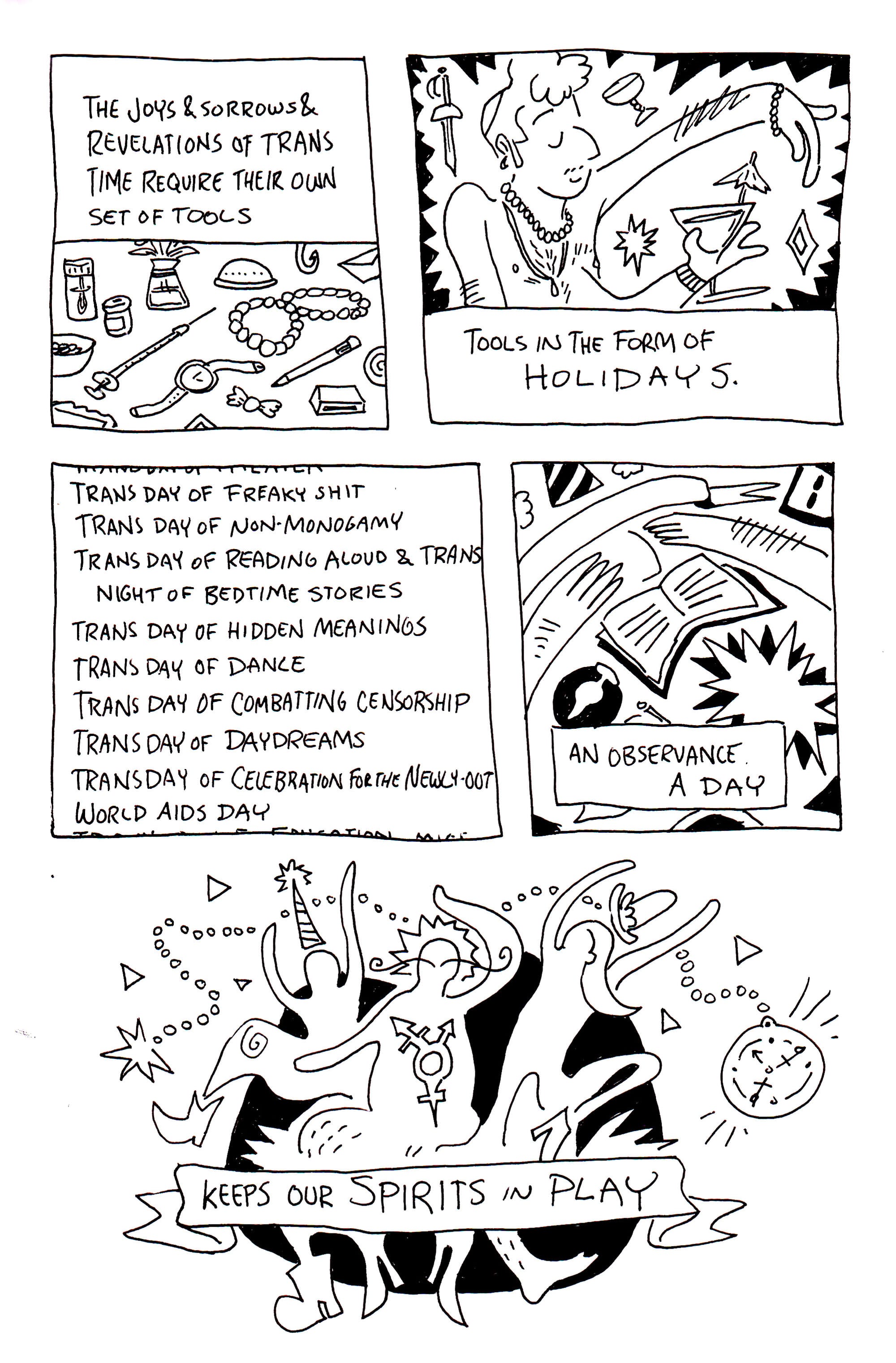 Celebrating days like "Trans Day of Simple Pleasures", "Trans Day of Striking Out", and "Trans Day of Revenge Fantasies" are in dialogue with "Trans Day of Writing It All Down", "Trans Day of Uncertainty", and "Trans Day of Mercy". Trans life is not a monolith. We need holidays that allow us multiplicity and encourage us to seriously explore it together.